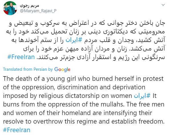 توئیت مریم رجوی در مورد خودسوزی سحر خدایاری
