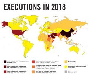 سازمان عفو بین‌الملل در سال ۲۰۱۸، در ۲۰ کشور جهان اجرای مجازات اعدام را ثبت کرده است. این تعداد، ۳ کشور کمتر از سال ۲۰۱۷ و ۱۱ کشور کمتر از سال ۱۹۹۹ میلادی بوده است.[۷]