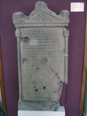 در حفاری‌های انجام شده به سال ۱۳۲۵ شمسی کتیبه بزرگی به ابعاد ۳۶×۸۵ سانتی‌متر در ۳۳ سطر به خط یونانی پیدا شد که در آن مردم نهاوند به اطاعت از فرامین حکومت خود فراخوانده شده‌اند. در بخش دیگری از این کتیبه دلایل ایجاد معبد برای خواهرش «اودیسه» شرح داده شده‌است.