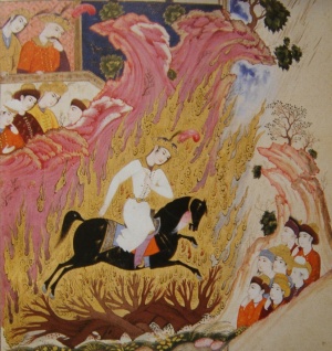 سیاوش بر اسبی تیزتاز برنشست و بی بیم و باک به قلب شعلههای سرکش آتش فرورفت. زبانه های آتش آن چنان بلند بود که «کسی خود و اسب سیاوش ندید».