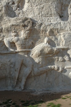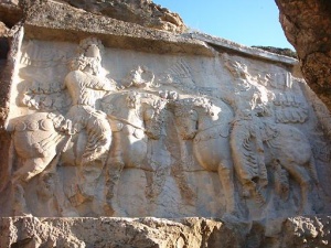 نقش برجسته شاپور اول ساسانی و اهورا مزدا، هر دو سوار بر اسب در نقش‌رجب در نزدیکی تخت‌جمشید