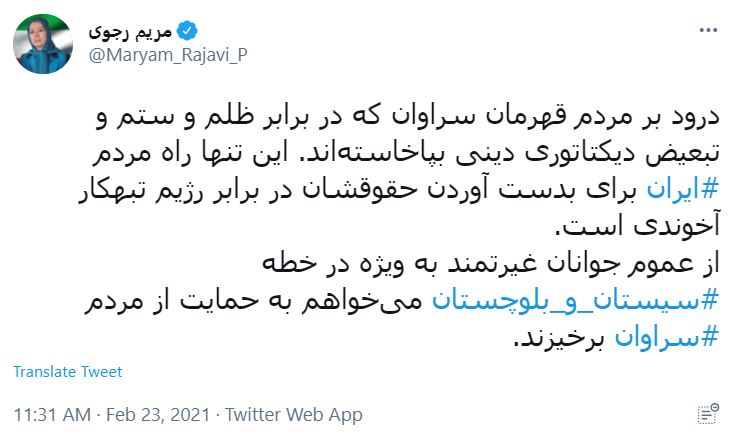 ۲ مارس ۲۰۲۱، ساعت ۲۳:۳۷ | توئیت مریم رجوی در مورد قیام سراوان.JPG (پرونده) | ۵۱ کیلوبایت | ۱ | ||