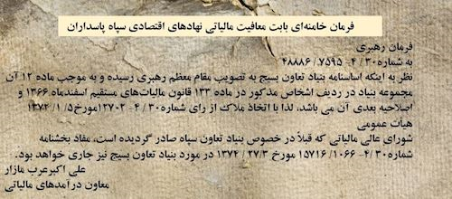 پرونده:فرمان خامنهای مبنی بر معافیت مالیاتی نهادهای اقتصادی سپاه پاسداران.png